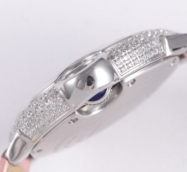 With a 28 mm diameter case in 18K rose gold, this watch is small and delicate, molding to the curves of a woman’s wrist for a comfortable and natural fit. The iconic blue balloon is rounded, the round case has smooth lines, and the right crown is set with a synthetic spinel cabochon wrapped in a curved bridge, reflecting Cartier’s recognizable aesthetic.