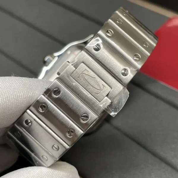 Cartier Santos series WSSA0013 watch inherits the brand’s 100 years of watchmaking tradition, a blend of classic and modern design concepts, popular and fashionable. The watch shell is made of refined and improved stainless steel, polished, stylized glass and sturdy and heavyweight; unique square case design with exquisite screws decoration, not only inherited the original customized for the flight pioneer Alberto Santos historical style, but also highlights the personality. The Roman numerals on the front are arranged to complement the delicate crocodile, ensuring accurate time reading; with a special anti-reflective treatment of the rainbow crystal glass, not only to enhance the visual perception, but also effective wear daily wear. The built-in movement of the watch, through strict testing to ensure stable timekeeping and excellent performance, no matter business formal wear or casual dress, are perfectly managed. When worn, the smooth and rounded bracelet fits comfortably with the skin of the wrist, highlighting the temperament of low-key luxury. Whether from the details of craftsmanship or the overall design, WSSA0013 demonstrates Cartier’s pursuit of a perfect balance between art and technology, and is the timepiece of choice for the modern urban elite. The exquisite craftsmanship and historical legacy have been passed down as an eternal classic, endowing the wearer with honorable professional charisma. It is a timeless and glamorous timepiece.