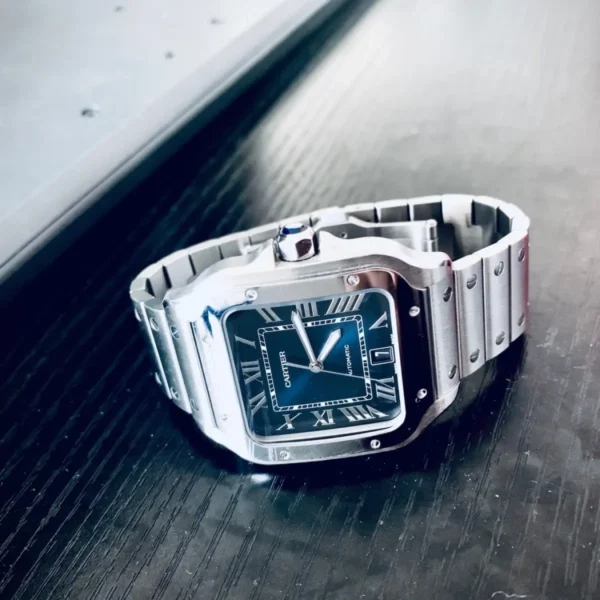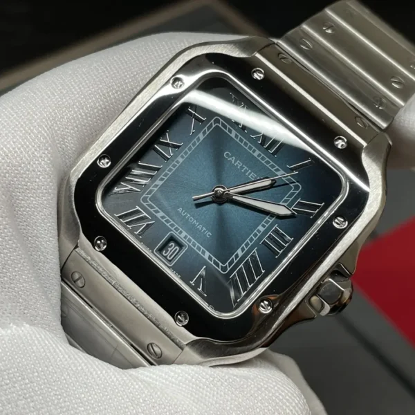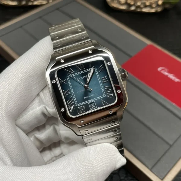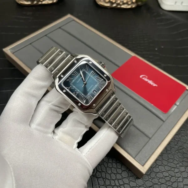 Cartier Santos series WSSA0013 watch inherits the brand’s 100 years of watchmaking tradition, a blend of classic and modern design concepts, popular and fashionable. The watch shell is made of refined and improved stainless steel, polished, stylized glass and sturdy and heavyweight; unique square case design with exquisite screws decoration, not only inherited the original customized for the flight pioneer Alberto Santos historical style, but also highlights the personality. The Roman numerals on the front are arranged to complement the delicate crocodile, ensuring accurate time reading; with a special anti-reflective treatment of the rainbow crystal glass, not only to enhance the visual perception, but also effective wear daily wear. The built-in movement of the watch, through strict testing to ensure stable timekeeping and excellent performance, no matter business formal wear or casual dress, are perfectly managed. When worn, the smooth and rounded bracelet fits comfortably with the skin of the wrist, highlighting the temperament of low-key luxury. Whether from the details of craftsmanship or the overall design, WSSA0013 demonstrates Cartier’s pursuit of a perfect balance between art and technology, and is the timepiece of choice for the modern urban elite. The exquisite craftsmanship and historical legacy have been passed down as an eternal classic, endowing the wearer with honorable professional charisma. It is a timeless and glamorous timepiece.