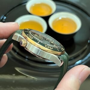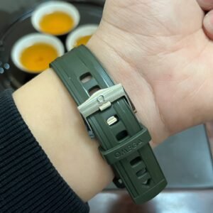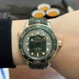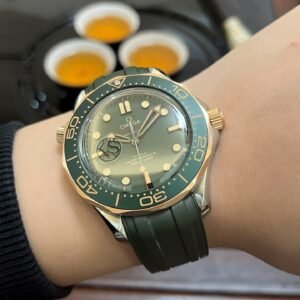 The all-new Seamaster series 300 meter wristwatch makes a strong debut, with its design inspired by James in the movie ‘007: No Time to Die’ The Haima 300 worn by Bond has a strong historical and retro feel, with full technical highlights: 1. The new model adopts a 42mm case Paired with genuine sapphire crystal glass pot lid with the same curvature. The Milan chain is just in the middle with a soft touch, combining the wear resistance and corrosion resistance of metal chains with the comfort of wearing belts. The green bezel and dial are made of oxalic acid anodized aluminum, which creates a more vivid and layered green color. The bezel is also paired with a retro style Super LumiNova luminous coating diving scale, emitting a super ice blue luminous effect in dimly lit environments. The hands are treated with PVD technology to present a bronze gold color, forming a vivid and harmonious color matching with the green dial 5 is equipped with the Calibre 8806 Ultimate Observatory movement, which vibrates at a frequency of 25200 times per hour (3.5 Hz). It is equipped with Omega’s iconic coaxial escapement mechanism and single shot bar box, providing 72 hours of power reserve. Through the back mirror of the watch, the automatic pendulum decorated with Geneva patterns and marked with red glossy paint can be appreciated.