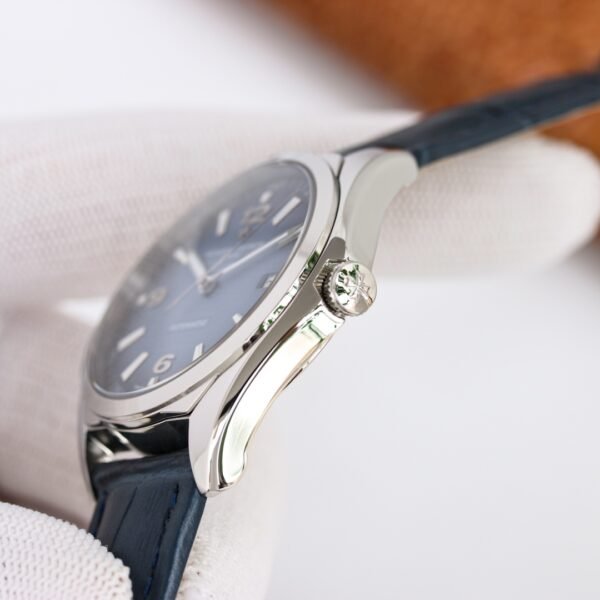 The 40 mm-diameter stainless steel case, with its smooth, rigid lines, reveals the harmonious proportions between the hexagonal case and the round dial. The case is satin-brushed and polished to reveal its craftsmanship. The blue sun-decorated dial exudes understated luxury, with three-dimensional hour-markers and toffee hands to ensure clear readability.